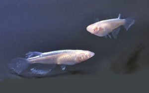 このアルビノ系の改良メダカ「龍の瞳」です。