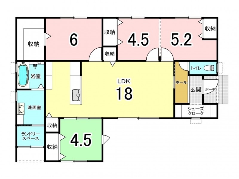リビングダイニングキッチン 18帖 和室 4.5畳 洋室 6帖 洋室 5.2帖 洋室 4.5帖