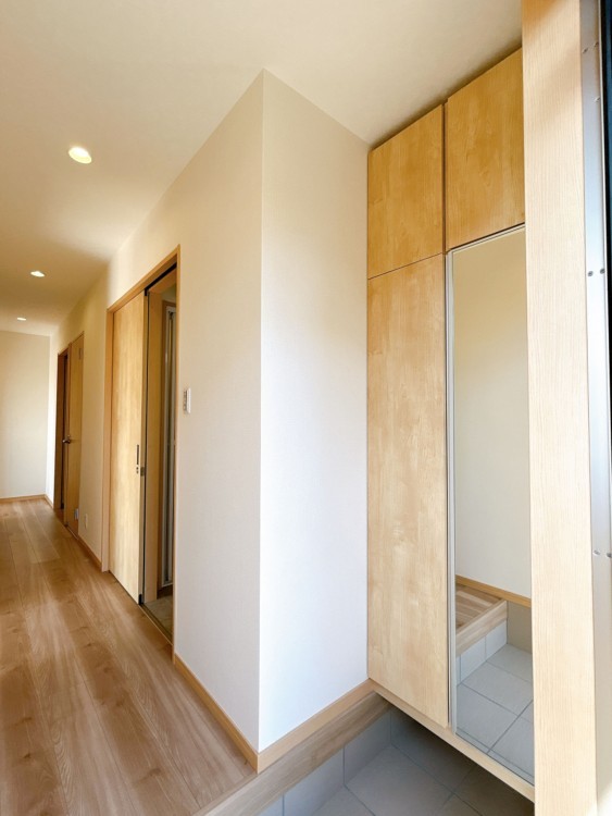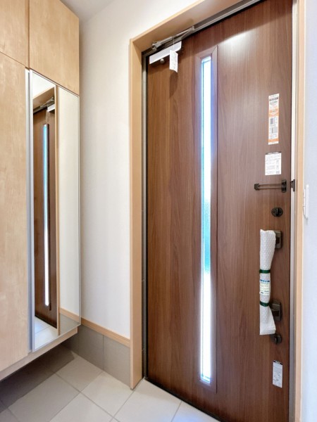 フローリング上張り・張替え、クロス・クッションフロア張替え、建具・クローゼット・シューズボックス交換、インターホン・火災警報器設置、照明LED交換まで行い、室内外ともにフルリニューアルされています。